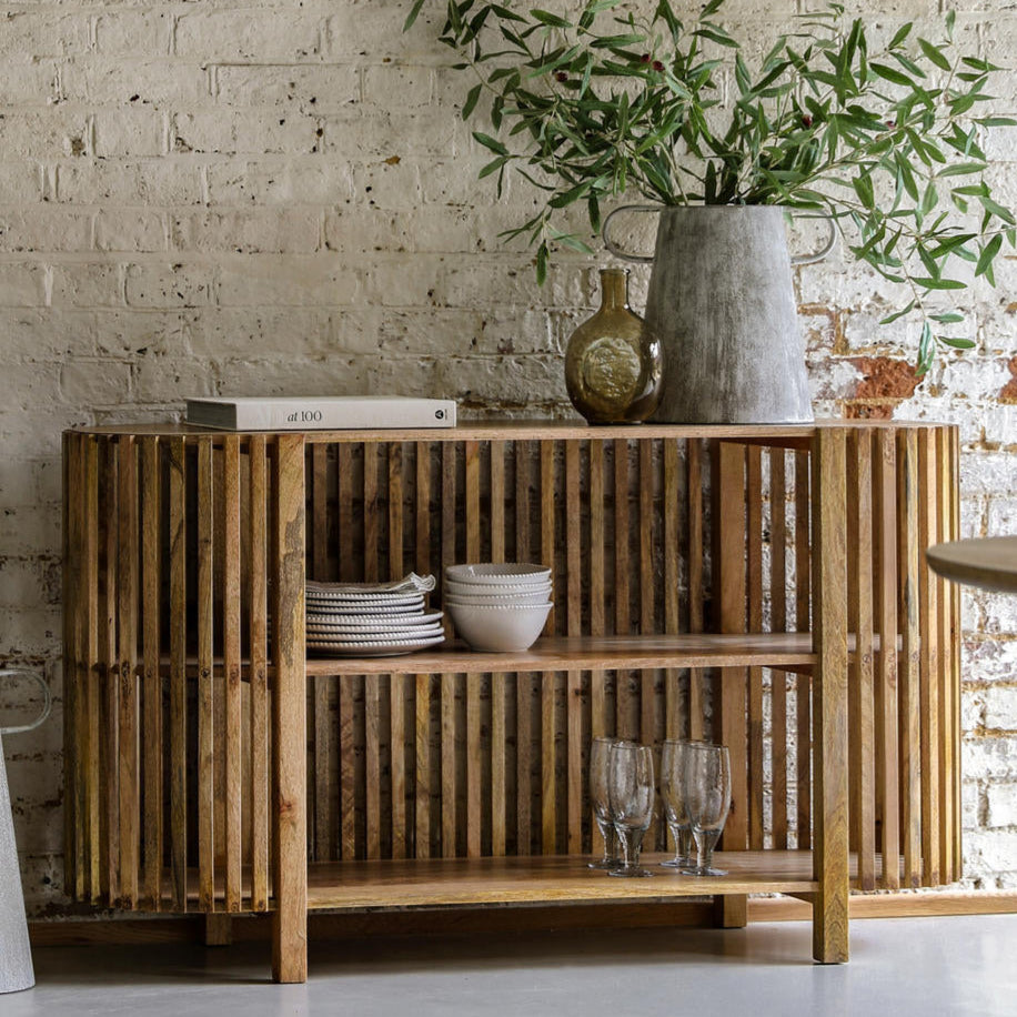 Vertical slats bring texture and rhythm to this open slatted wood console table with interior shelf. Crafted from acacia, it has a warm, natural presenc... Read More