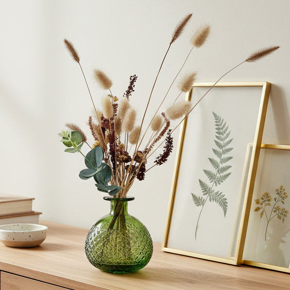 A recycled glass vase with a distinctive rounded silhouette and narrow neck opening. The Rolla shape makes it ideal for displaying single stem flowers or small dried arrangements.