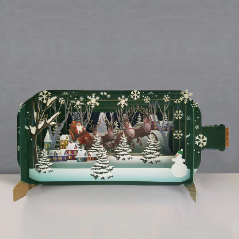 This innovative card features multiple layers of card artfully slotted together in a three-dimensional design, standing freely in the shape of a bottle, complete with a cork. Inside, you'll find an enchanting scene that adds a touch of charm.