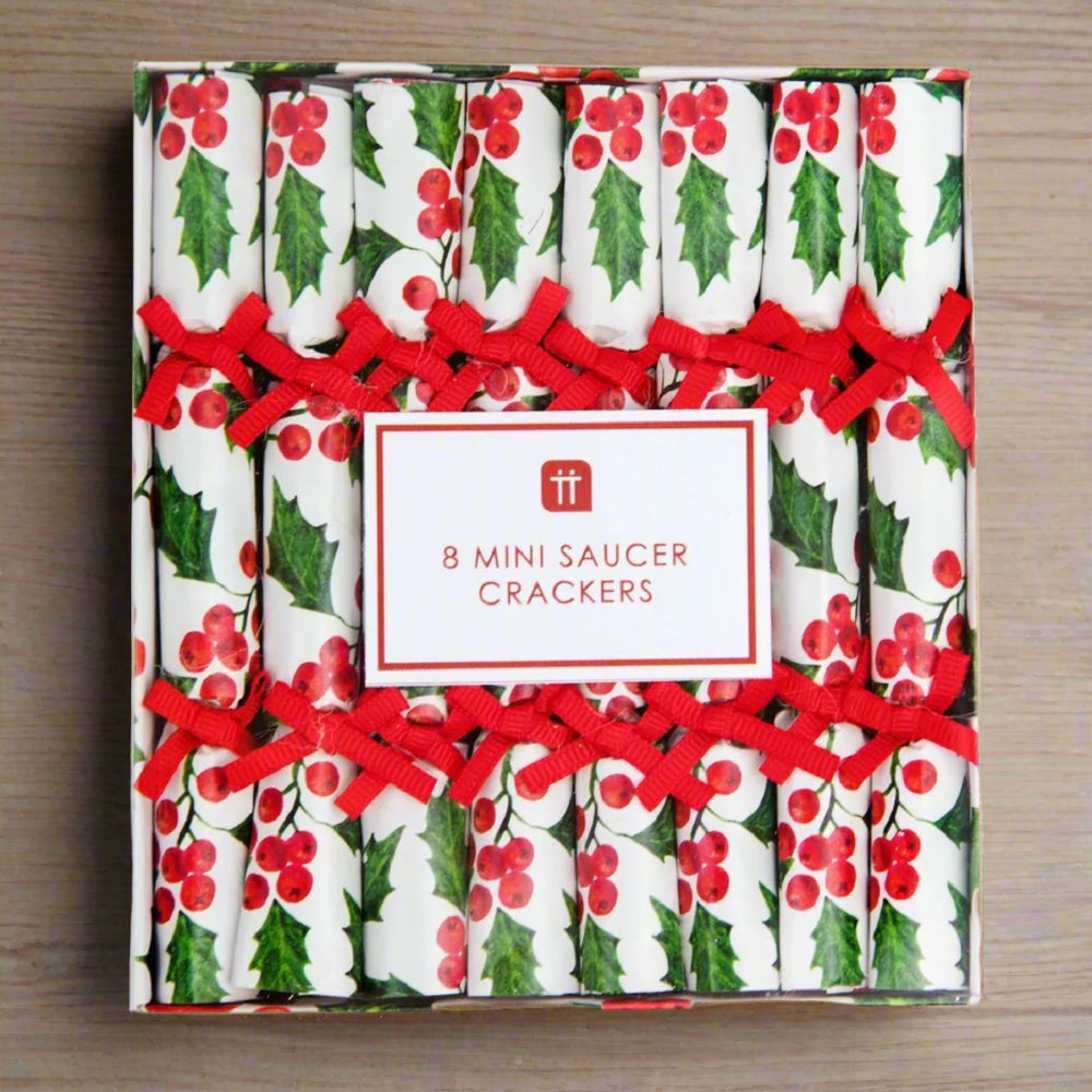 Add some festive cheer to your Christmas table with our miniature Holly Saucer Crackers. These mini Christmas crackers feature a holly and berry design with red ribbons, perfect for adding a touch of Christmas spirit to your dining experience. Share in the holiday tradition of pulling these crackers for a fun surprise and memorable meal.