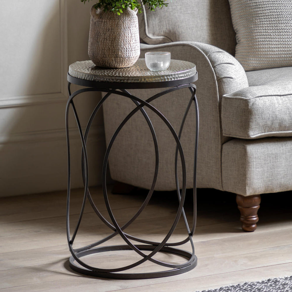 A hammered gold top brings texture and shine to this side table. Supported by a slim black frame, it feels both delicate and strong. A statement accent that lifts any room.