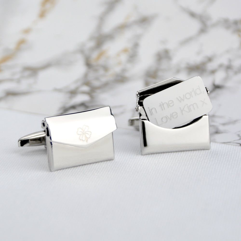 Featuring a pair of silver metal envelope cufflinks with a lucky four leaf clover engraved on the flap as standard. Open the envelope and inside there is a little metal insert - a secret message letter onto which we will hand engrave your message of support on one or both sides as you wish. Simply pop the insert back inside the envelopes and close the flap for safe keeping and wear close to you at all times.