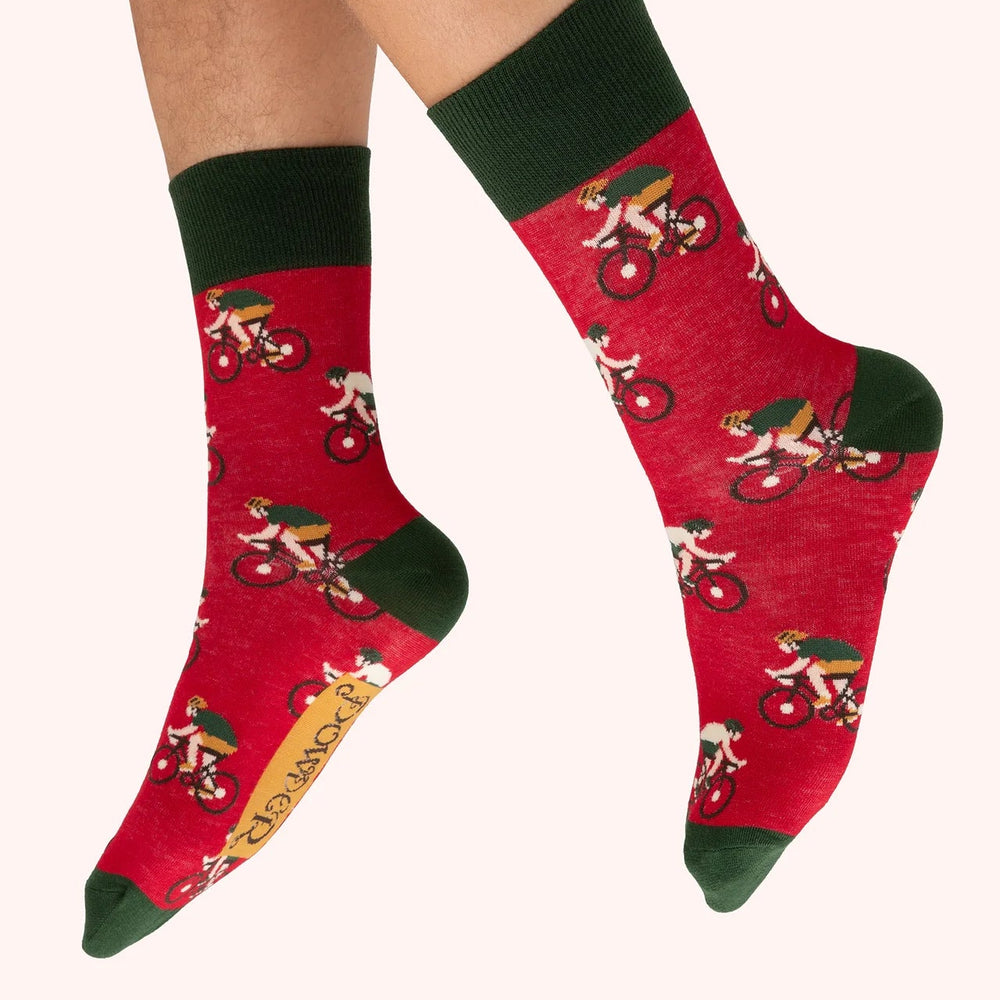 Red socks with green accents and bicycle design on a white background