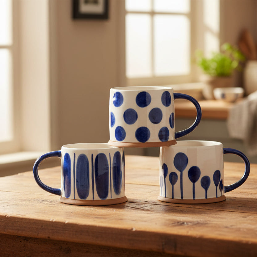 These elegant chunky ceramic mugs combine a striking blue and white design with a warm terracotta base, blending contemporary style with rustic charm. Available in three unique patterns, each mug offers a sophisticated touch to your morning routine or afternoon tea. Select your preferred design by emailing us or allow us to surprise you with one of these beautifully crafted pieces.