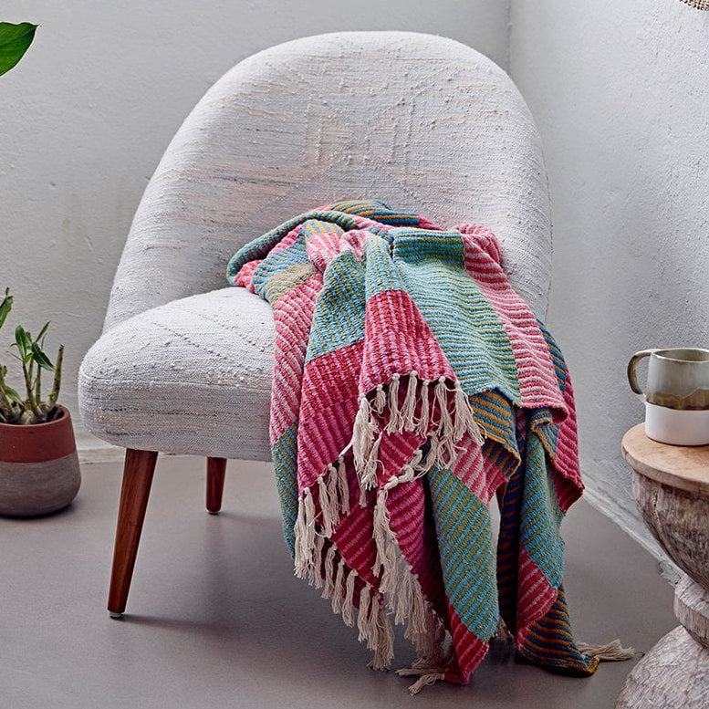 The Isnel recycled cotton throw features wide stripes in pink and green tones with loose fringes along the edges. This woven throw works well draped over sofas, armchairs, or as an extra layer on beds.