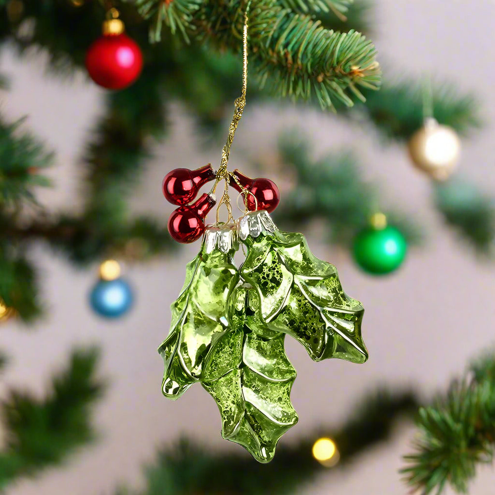A stunning glass holly and berries hanging bauble for your Christmas tree.